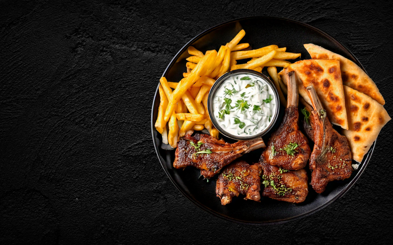 Schweinekotelett mit Schweinebauch mit Tzatziki und Pommes
